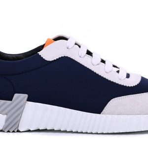 DELIVERY ALL OVER UAE ( 1-2 DAYS ) This is an authentic pair of HERMES Technical Canvas Suede Goatskin Bouncing Sneakers in Marine. These stylish sneakers are crafted of navy fabric, with white suede leather trim. These sneakers feature white laces and white rubber soles with a grey Hermes H logo.