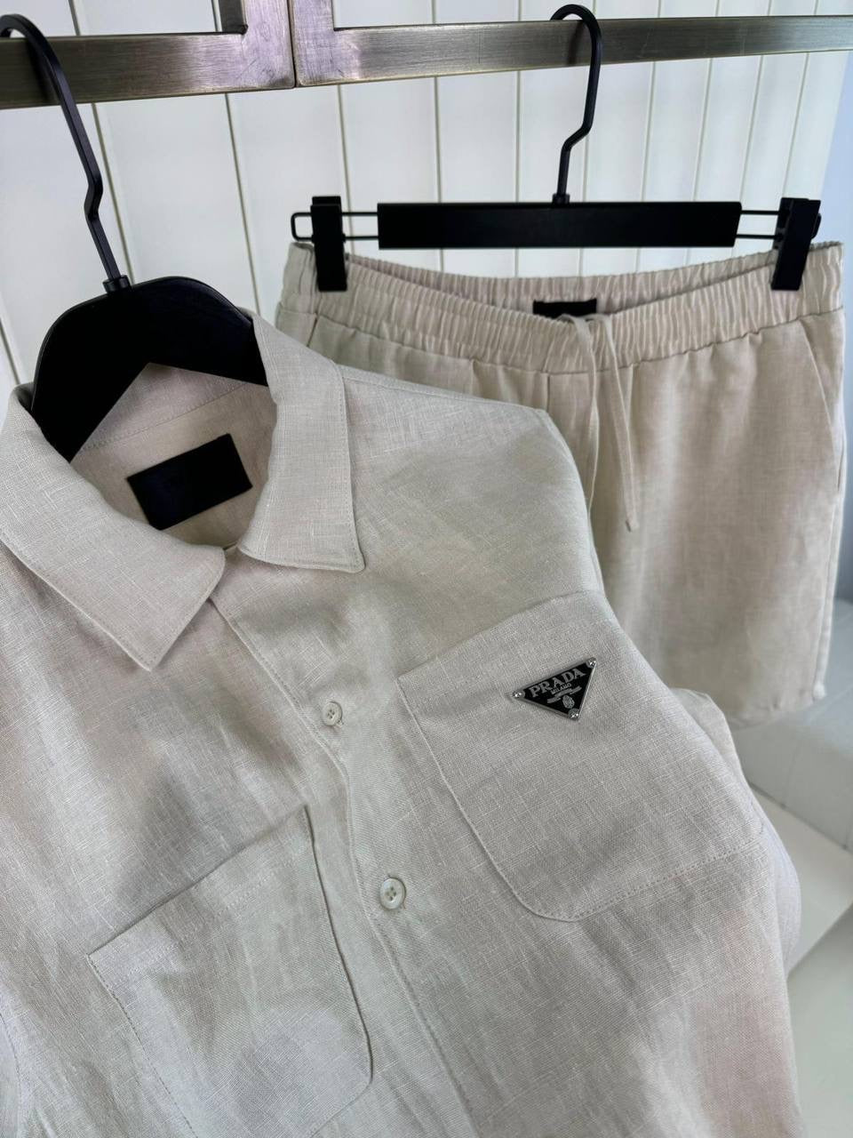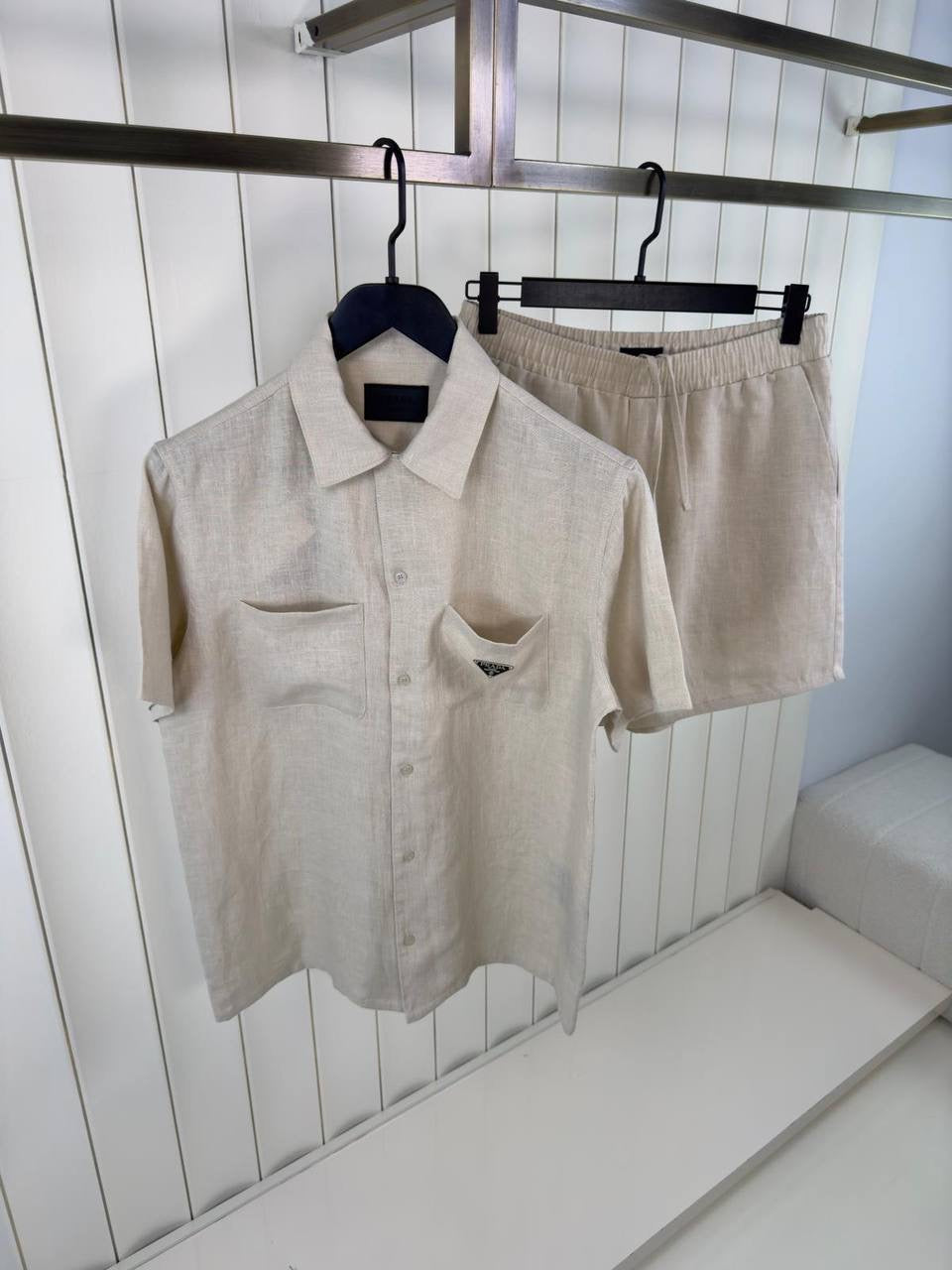 Beige Linen-style Two-piece Set consisting Of a Short-sleeved Shirt and Short