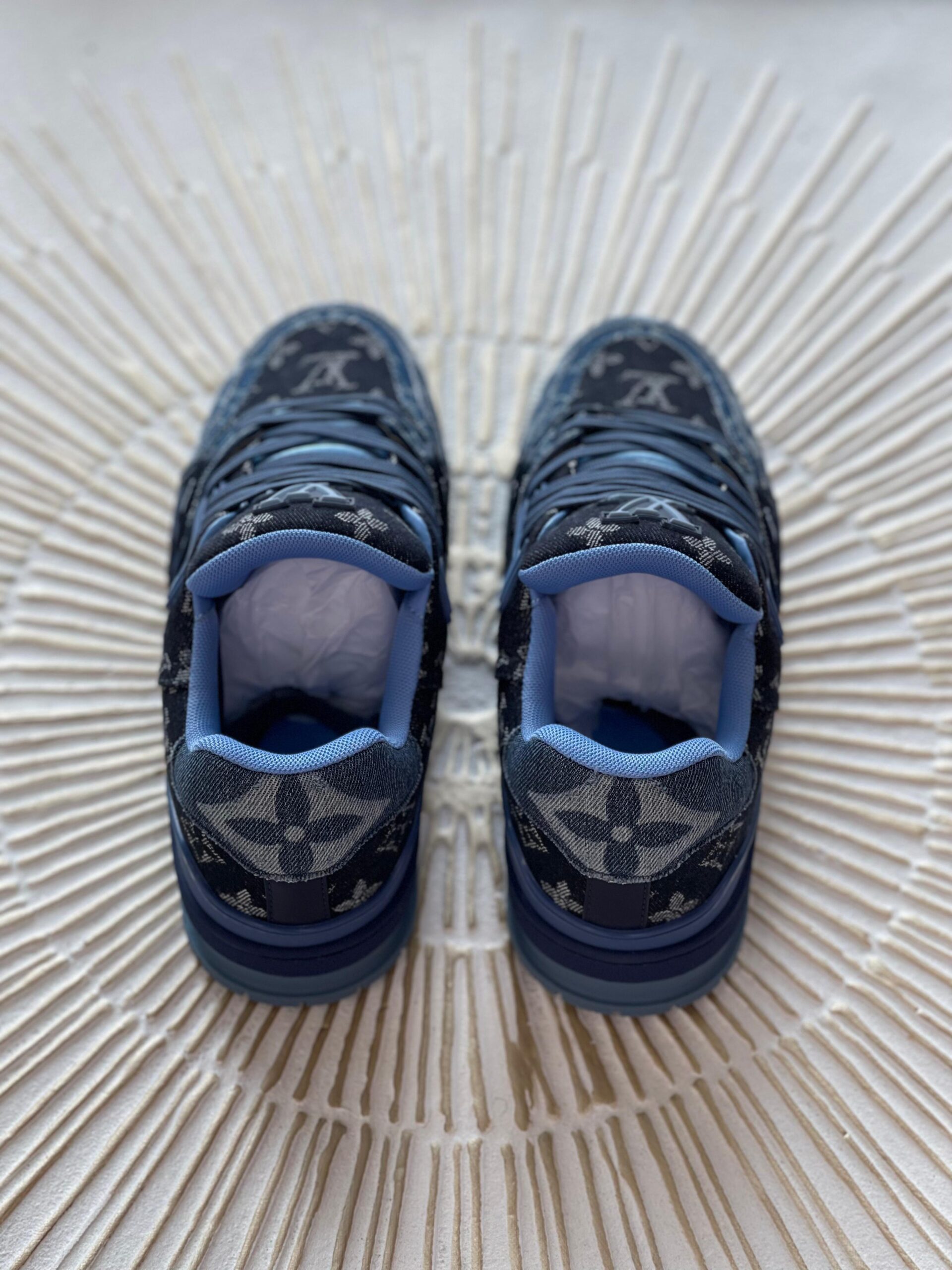 | Description | Blue denim-trimmed LV Trainer with monogram overlays, denoting creative collaboration and Italian craftsmanship. |