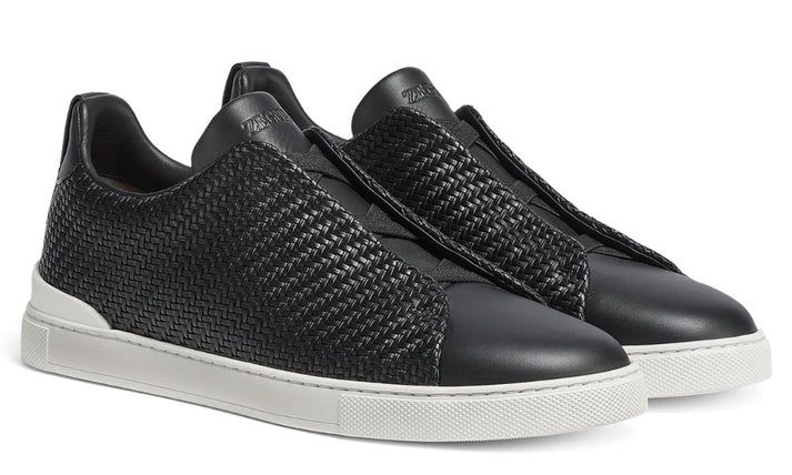 Distinguished by their woven leather uppers, the black PELLETESSUTA™ Triple Stitch™ low top sneakers combine rich materials with unique texture. Lightweight and flexible, this special design is a luxurious take on casual footwear. The sneakers slip on easily thanks to the collection's iconic, triple-crossed elastics, which evoke the hand-stitching of classic leather shoes.